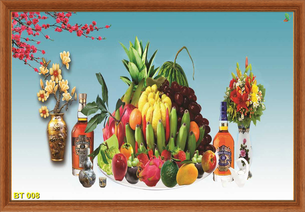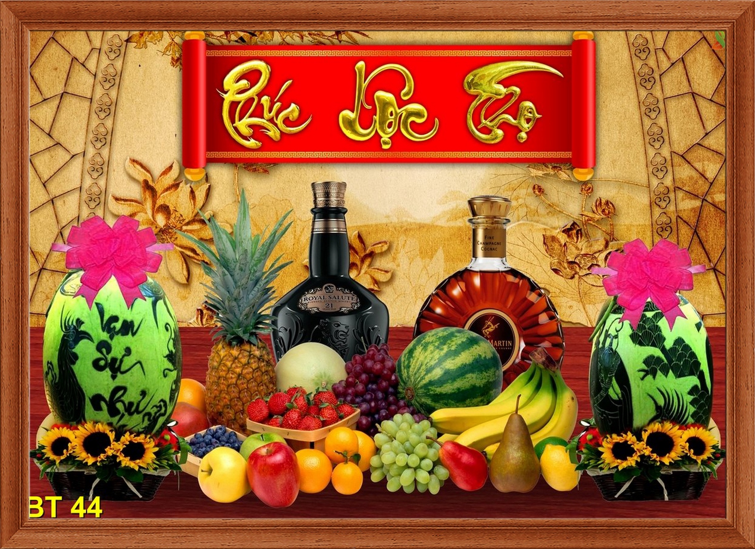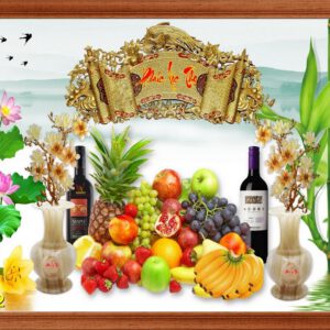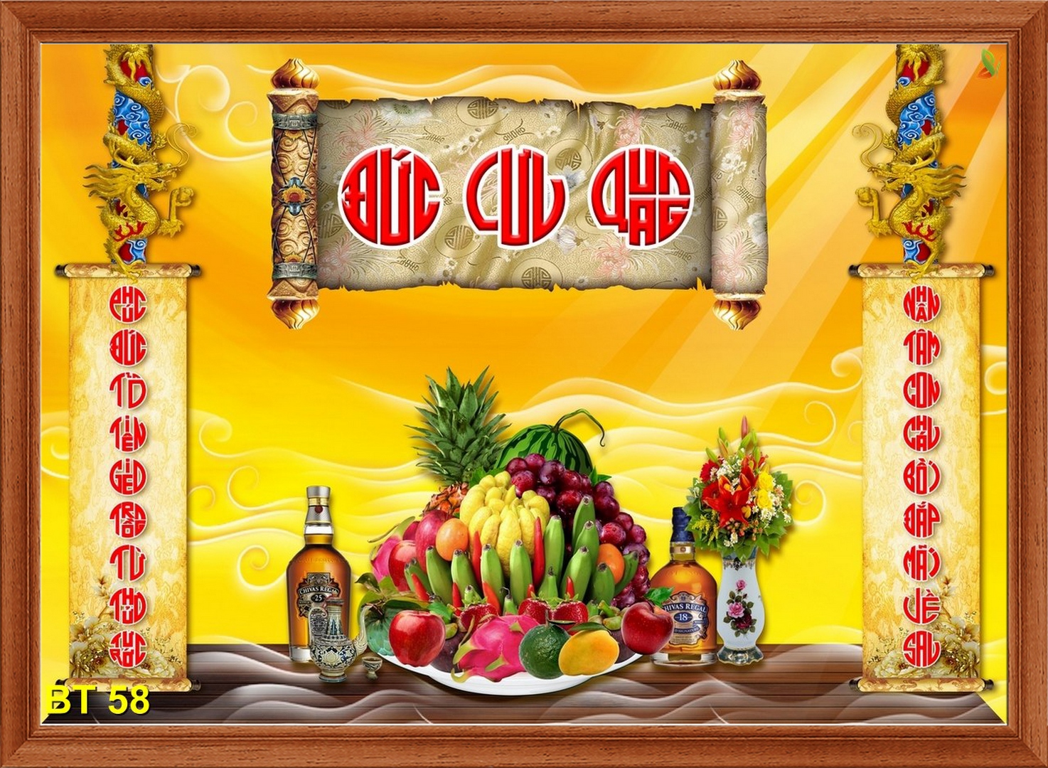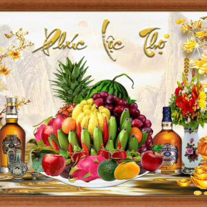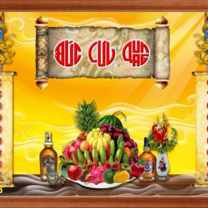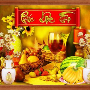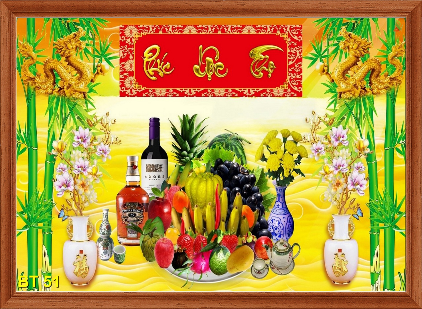 Tranh 3d dán Bàn Thờ Mâm Ngũ Quả Tụ Lộc Phú Quý đầy nhà