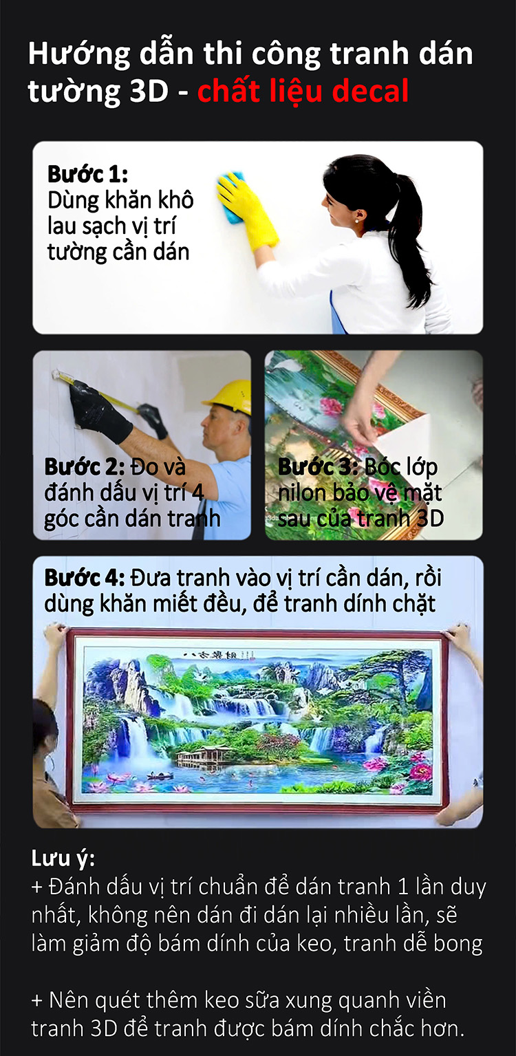Mỗi chất liệu tranh 3D sẽ có cách thực hiện thi công khác nhau. Sau đây là hướng dẫn bạn các bước thi công tranh dán tường 3D tại nhà cho 2 chất liệu Decal và Vải Lụa.